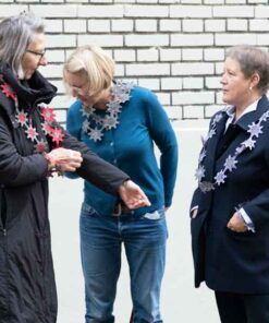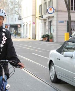 Retroreflektierend, Schmuck, klein und handlich ist die Alternative zur gelben Leuchtweste. Es besteht aus hochwertigem oekotex zertifiziertem Stoff aus der EU und CH bestehend aus Microfaser und Glas. Der Entwurf und die Fertigung entstehen im Atelier Sichtschicht in Zürich. Die Blumen werden in Kleinserien hergestellt, zu Ketten als Leuchtbändel geknüpft und kommen in verschiedenen Farben vor. Sie sind schmückede Alltagsbegleiter und elegante Varianten der Leuchtbändel, die Kindern zur Sicherheit im Strassenverkehr angezogen werden. Die Sichtschicht Blumen, Ponchos und weiteren Sichtschicht Produkte werden alle von Hand in der Schweiz hergestellt und sind No-waste-Produkte, was heisst es gibt kaum Verschnitt oder Produktionsabfall. Sichtschicht wurde von der Jury des VCS-Wettbewerbs zum Jubiläum «200 Jahre Velo » mit dem ersten Preis ausgezeichnet, wie sich Velofahrende auf ästhetische Weise im Alltag sichtbar machen können – schöner als die klassischen Leuchtbändel