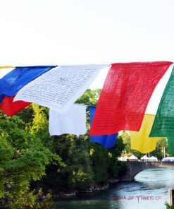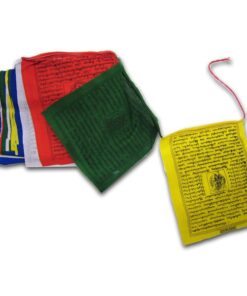 Die mit Holzblöcken von Hand aufgedruckten Sanskrit-Mantras (Gebete) in tibetischer Schrift richten ihre Wirkung zu uns selbst und in die ganze Welt. Dies kommt also sowohl dem Menschen, der die Gebetsfahnen aufhängt, als auch seiner näheren und weiteren Umgebung zu Gute, denn jeder wird beim Anblick der sich im Wind bewegenden Gebetsfahnen seine Gedanken kurz schweifen lassen, und sich so den ausgesandten Energien hingeben. 5 Farben, div. Drucke, ca. 9 Meter, Baumwolle, reissfester Polyester-Schnur