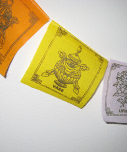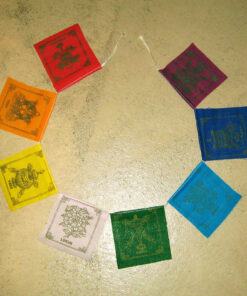 Handgefertigte Gebetsfahnen (9×10 cm) von Pema aus Tibet, auf faire Weise hergestellt und gehandelt von Pema aus Tibet. Auf faire Weise hergestellt und gehandelt