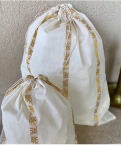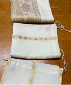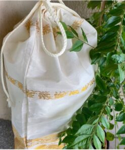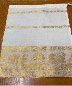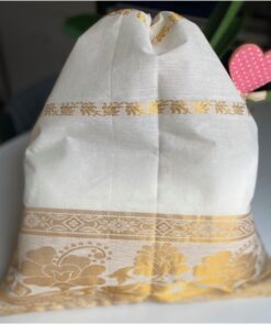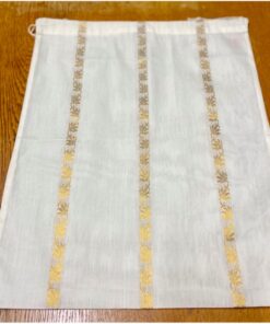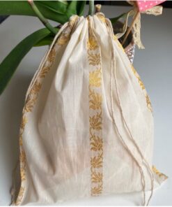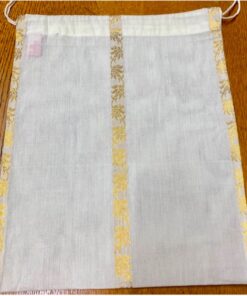Material: Bauwolle cremefarbig mit eingewobener goldfarbiger Borde, Verschluss BW-Kordel zum Schliessen.