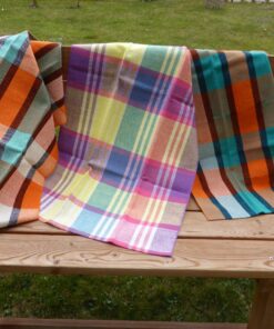 Die verschieden bunten Geschirr- oder Handtücher werden in Haiti auf einfachsten Webstühlen gewoben. Sie sind aus Halbleinen und können mit 60 Grad gewaschen werden. Sie färben nicht ab und gehen nicht ein.