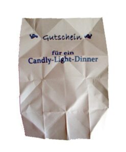 Dieses Produkt enthält 16 verschiedene Gutscheine (z.B. für einen Abend ohne Strom, einen Spaziergang oder einen Liebesbrief) welche man jemandem schenken kann, oder aber man zieht abwechselnd Gutscheine. Die Gutscheine sind als Herze im Origami Stil gefaltet.