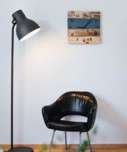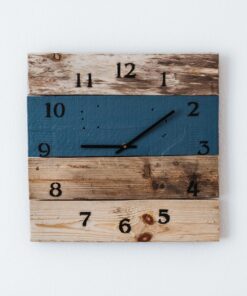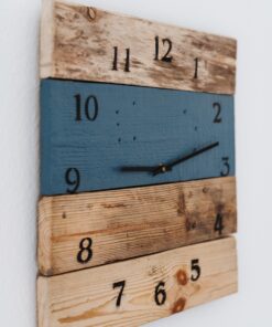 Diese Uhr im Industrial Chic Stil ist ein absoluter Hingucker und verbreitet mit dem natürlichen Holz eine wohnliche Atmosphäre in Ihrem Zuhause. Sie kommt an einer grossen Wand besonders zur Geltung. Die Asymmetrie in der Symmetrie macht dieses Möbelstück zu einem eigenständigen Kunstwerk. Sie wird aus Palettenholz und einem Quarzuhrwerk hergestellt und kann mit einem blauen, türkisen und weissen Balken bestellt werden.