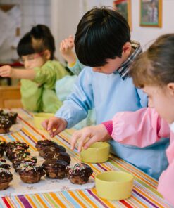 Die Kinderschürzen sind ganz leicht anzuziehen. Die Kinder schlüpfen von hinten rein und schliessen sie einfach mit einem Klettverschluss im Nacken. Die langen Ärmel mit dem Bündchen und die Länge bis auf die Mitte der Oberschenkel schützen die Kleidung effektiv. Wasserfestes Material und gut verarbeitete Nähte machen die Schürzen undurchlässig, widerstandsfähig und langlebig. Sie lassen sich bei 40° in der Maschine waschen.