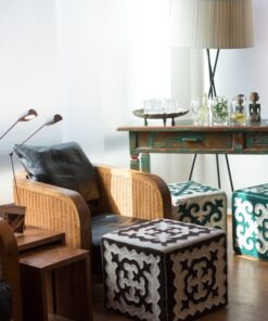 Dieser Hocker lassen sich sowohl mit traditionellen, wie auch modernen Möbeln kombinieren. Die archaischen Ornamente werden nach traditionellem Filzhandwerk von Nomadinnen in Kirgisien hergestellt. Ein Lieblingsstück fürs Leben. Bei den Mustern und Farben gibt es leichte Variationen. Jedes Stück ist ein Unikat.