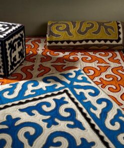 Die uralte Kultur und die archaischen Formen der kirgisischen Filzprodukte lassen sich perfekt mit moderner Ästhetik und urbanem Lebensstil zum stilvollen und exklusiven Ambiente verbinden. Die Farben und Ornamente sind ausnehmend schön, sie sind weltweit einzigartige Naturprodukte. Ihre Ornamente stellen abstrahierte Formen aus der Tier- und Pflanzenwelt der Bergsteppe dar: Blume, Adler, Steinbock, Sonne und Mond … Filzen gehört zu den ältesten Textiltechniken überhaupt. . Filz ist temperaturbeständig, schlecht brennbar, schall- und kältehemmend. Das natürliche Wollfett (Lanolin) macht sie schmutzabweisend. Diese Filzhocker wurden in Kirgistan in liebevoller Handarbeit gefertigt und in der Schweiz mit einem hochwertigen Schaumstoff gefüllt und dauerhaft gegen Mottenbefall geschützt.