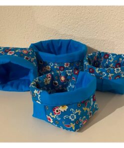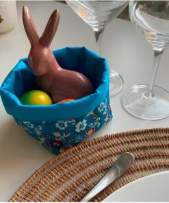 - Utensilios: Stoffkörbchen für den Ostertisch. Beidseitig benutzbar innen uni türkis, aussen türkis mit Blumenprint. Höhe/Druchmesser 10x12cm, Boden 8x10cm.