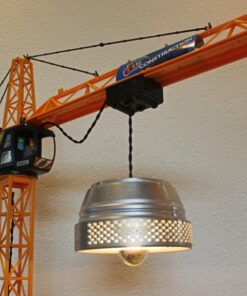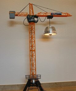 Der grosse Spielzeugkran dient nun als witzige Lampe für Junge und jung gebliebene. Mit der Höhe von 1,2m kann der Leucht-Kran sowohl auf den Boden wie auch auf einem Tisch platziert werden. Der Kran-Arm ist schwenkbar, die Höhe der Lampe ist fix. Der Lampenschirm ist ein altes Camping-Geschirr welches durch die Löcher einen schönen Schattenwurf macht.