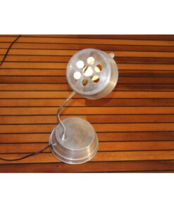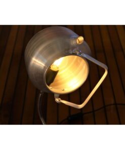 Schreibtischleuchte hergestellt aus Campinggeschirr. Der Sockel ist ein ausbetoniertes Pfännchen.