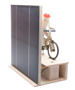 Tomi und sein Velo bewegen sich verblüffend realistisch. Hölzerne Riemenscheiben und ein Solarmotor, versteckt in einem Holzsockel, übertragen die Drehung auf die Veloräder und lassen tomi unermüdlich in die Pedalen treten.