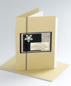 Set bestehend aus drei verschiedenen Trauerkarten, die individuell von Menschen mit einer Beeinträchtigung hergestellt werden. Jede Karte ist ein Unikat und zwei der Karten sind mit einem einfühlsamen Spruch versehen. Die Karten werden mit einem Couvert und samt Einlageblatt in einer Cellophanhülle angeliefert.
