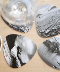The sea may be miles away, but lakes are a constant, from tingling Alpine tarns the colour of gemstones that reflect mountain peaks in the still calm of morning, to the palm-fringed waters of sun-drenched Ticino. Switzerland has around 1500 lakes and more than 12,900 smaller bodies of water and additionally many waterfalls Our wooden products are FSC certified. They are made of birch veneer and the surface consists of melamine-dipped paper. Melamine is an organic compound and used to make our products durable. It is also the melamine that makes them water-resistant. The melamine is tightly bound in our products, something we ensure by having the products undergo a Food Contact test. Each product is a hand made piece of craft made one by one. Care instructions: Birch veneer products have been tested in restaurant dishwasher up to 95 degrees. Dry off with soap and water with a cloth Size: 9 cm