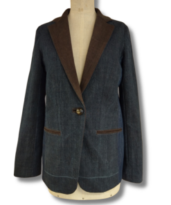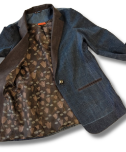 Dieser handgefertigte Blazer ist ein echtes Statement für Individualität und bewusstes Design. Aus hochwertigem, recyceltem Denim gefertigt, kombiniert er lässige Eleganz mit einem Hauch von Extravaganz. Die raffinierte Innenausstattung aus feinem Stoff mit stilvollem Blätter-Print verleiht dem Blazer eine unverwechselbare Note – ein Blickfang, ob offen getragen oder geschlossen.
