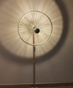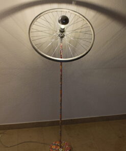 Der Sockel der Stehlampe wurde im Wassertransferdruck mit einem wunderbaren Blumenmuster veredelt. Als Träger für die Lampenfassung dient eine Fahrradfelge welche schwenkbar ist. Zusammen mit der Kopfspiegellampe gibt dies einen herrlichen Schattenwurf.