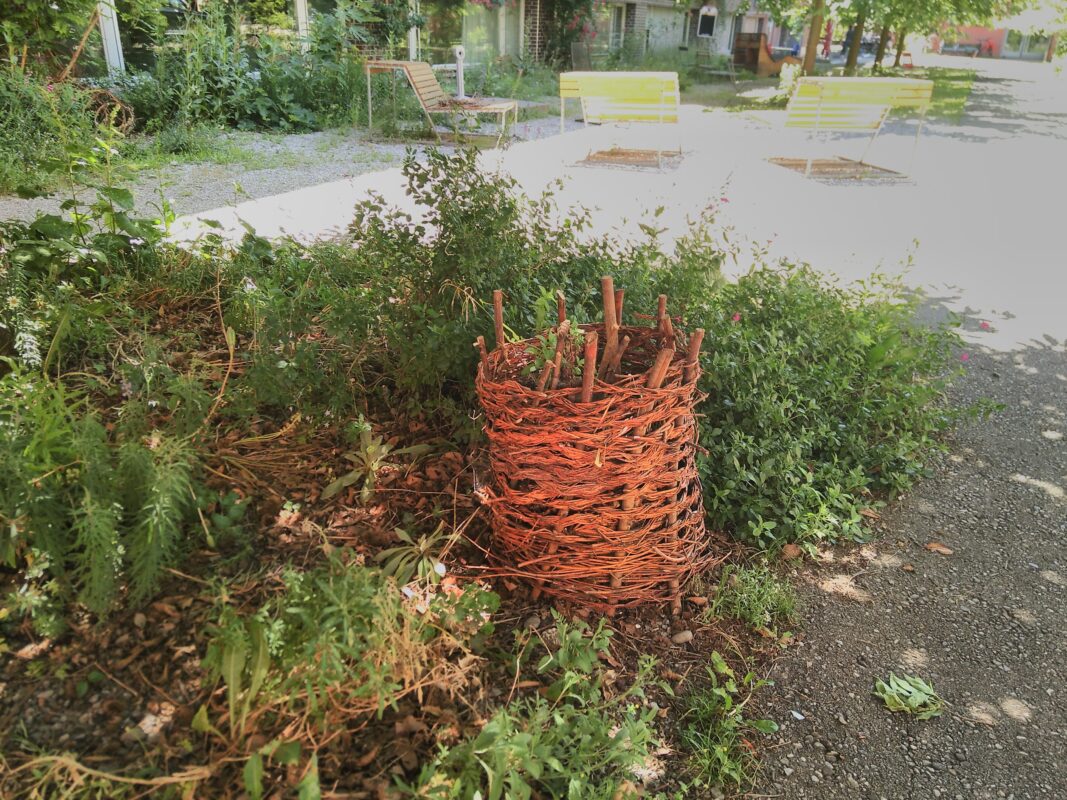In der Umgebung des Faircustomer Showrooms, rundum das Kraftwerk1 und auf der Stadionbrache hat Tania Schellenberg grosse Körbe aus mit lokalen Materialien gebaut und experimentiert mit einem System von Mini-Kompost-Körben, die zum Aufbau vom Boden und zur Düngung der Gemüse und Blumenbeete dienen.